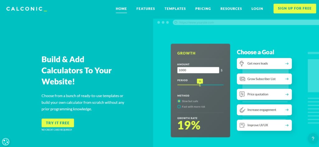 Calconic is strong when the fastest path to a lead-gen calculator is “start from a proven template, adjust, embed.” It explicitly highlights free sign-up plus access to premium features for 14 days.