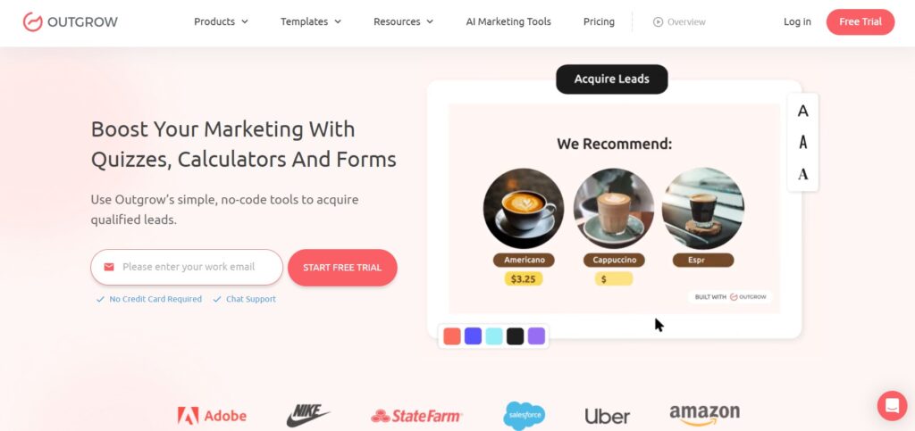 Outgrow positions itself around creating calculators, quizzes, assessments, and product recommendations that generate leads.