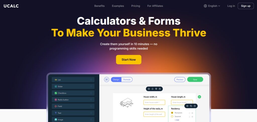 - uCalc is explicitly positioned as a universal builder of calculators/forms, emphasizing visual creation “without coding skills” and the ability to build calculators of any complexity for business service estimation.